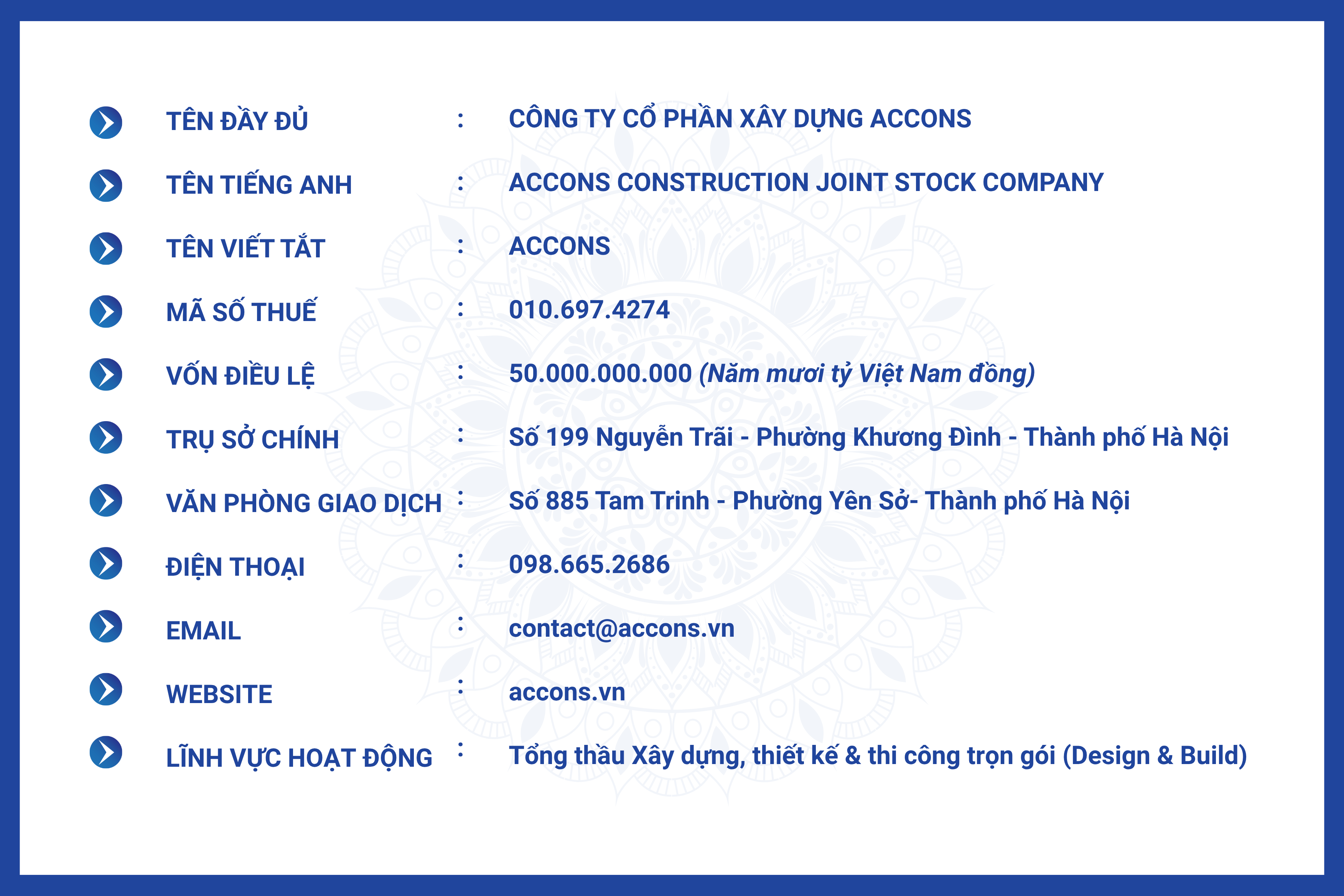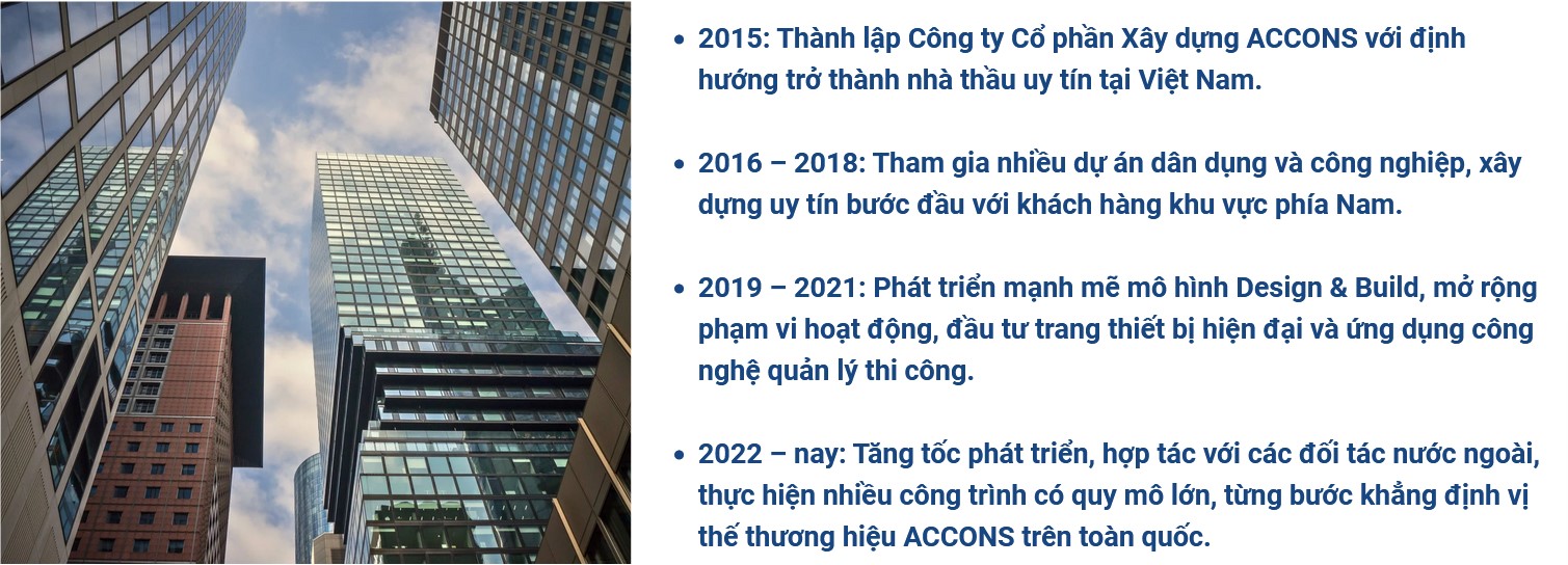 ♦ CHẤT LƯỢNG – Mỗi công trình là một tuyên ngôn. ACCONS cam kết đạt đến chuẩn mực kỹ thuật – thẩm mỹ – bền vững cao nhất trong từng hạng mục. Chúng tôi không chỉ hoàn thành dự án – chúng tôi tạo ra những công trình truyền cảm hứng và có giá trị sử dụng dài lâu.