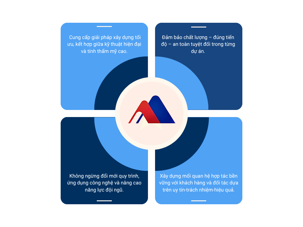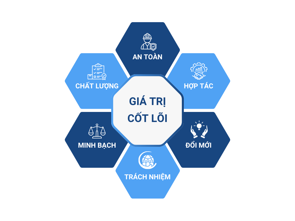 ♦ AN TOÀN – Đặt con người làm trung tâm - An toàn không chỉ là quy định, mà là cam kết sống còn. Chúng tôi xây dựng môi trường thi công và làm việc nơi mọi người đều được bảo vệ, tôn trọng và có thể phát triển lâu dài.